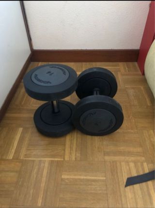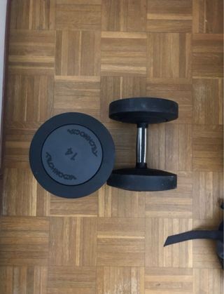 Conjunto de mancuernas ajustables con discos para entrenamiento en casa. En perfecto estado. El precio incluye: - Dos barras metálicas de 35cm de largo, 3cm de diámetro y unos 2kg de peso cada una. - Ocho discos de caucho de 2kg de peso cada uno (marca Domyos). - Cuatro cierres de seguridad.