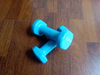 Conjunto de dos mancuernas Domyos de color azul. Cada mancuerna pesa 1.5 kg.
