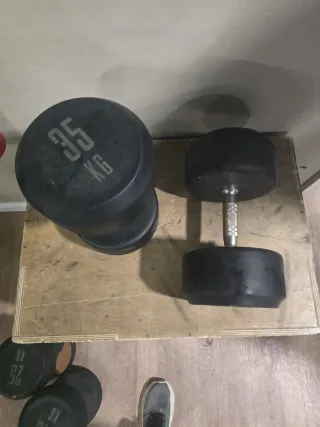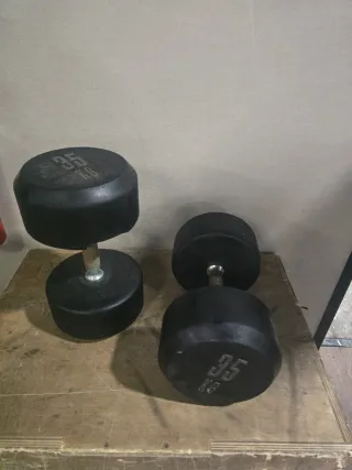 Par de mancuernas de la marca Hammer Strength. - Peso: 35 kg cada una. - Diseño ergonómico para un agarre cómodo. - Materiales de alta calidad para mayor durabilidad.