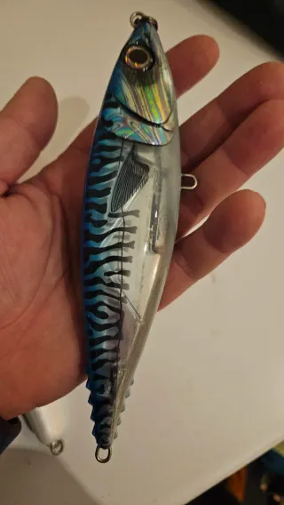 Conjunto de tres señuelos de pesca. - 2 señuelos Labana Diving 188mm 100gr 30e und - Un señuelo Mack Stick Savage Gear. 20e