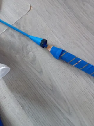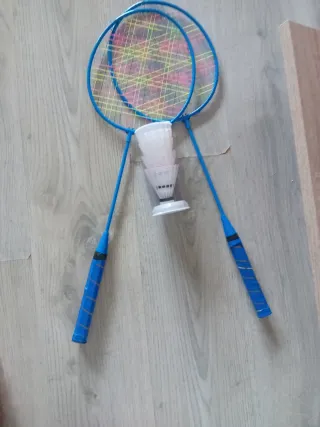 Set de raquetas de bádminton con volantes. - Dos raquetas de color azul. - Mallas de colores en las raquetas. - Empuñaduras azules. - Varios volantes blancos incluidos.