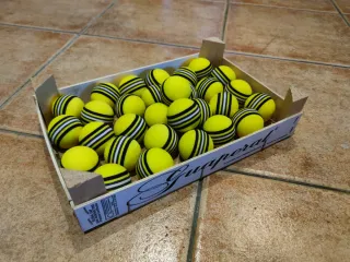 Pack de 30 bolas ligeras, ideales para practicar golf en casa o en espacios reducidos. Su diseño a rayas amarillas y negras las hace fácilmente visibles. - Cantidad: 30 unidades. - Color: Amarillo y negro. - Casi no pesan y no pueden romper nada - Para practicar el chip o el approach