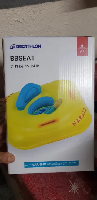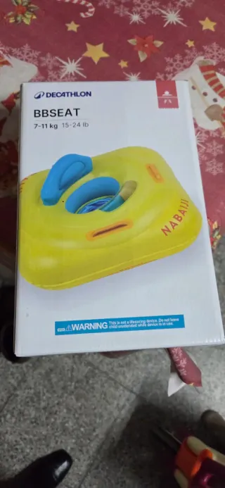 Flotador para bebé de la marca Decathlon, modelo BBSEAT. - Diseñado para bebés de 7 a 11 kg (15-24 lb). - Color amarillo con detalles en azul. - Advertencia: No es un dispositivo salvavidas. - Usado 1 sola vez - Precio en tienda 12€