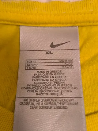 Camiseta de la selección de fútbol de Brasil. - Color amarillo. - Logo de la CBF y BRASIL estampado. - Marca Nike. - Pequeña tara en la parte baja frontal.