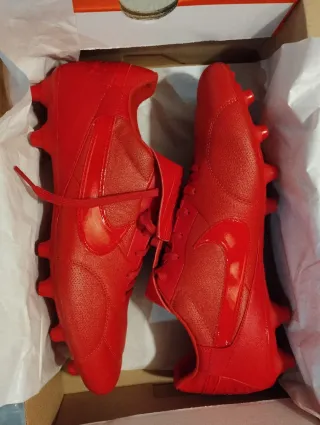 Botas de fútbol Nike de color rojo intenso. Perfectas para destacar en el campo. - Diseño deportivo. - Logo de Nike. - Tacos para césped.