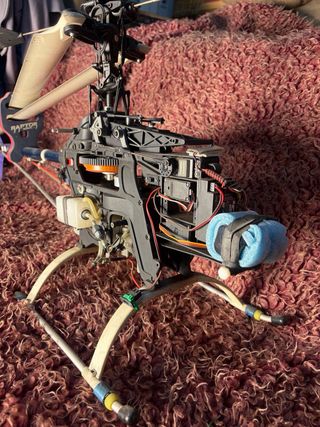 Helicóptero radiocontrolado modelo Raptor. - Diseño detallado. - Componentes mecánicos visibles. - Patines de aterrizaje. - Rotor de cola púrpura.