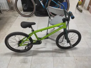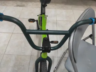 Bicicleta BMX de color verde, lista para rodar. - Cuadro de BMX. - Manillar con puños azules. - Manillar y orquilla recién pintados Incluye freno desmontado (no sé si funciona)