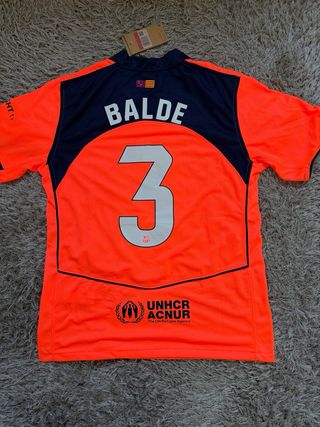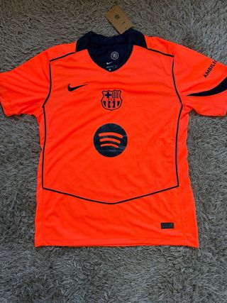 Tercera equipación oficial del FC Barcelona para la temporada 2025/26. Diseñada con los colores característicos del club. - Color naranja vibrante. - Cuello y detalles en azul marino. - Escudo del FC Barcelona. - Logo de Spotify. - Logo de Nike.