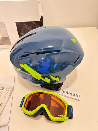 Conjunto de casco y gafas de esquí para niños, en color azul con detalles llamativos. - Casco de esquí azul con diseño gráfico en verde lima y azul. - Gafas de esquí con lente naranja y montura verde lima.