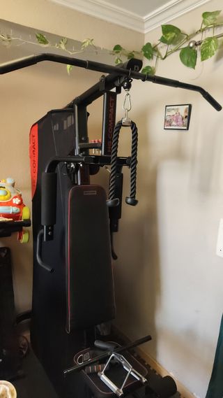 Máquina de gimnasio multifuncional Cecotec Drumfit. - Estructura de acero resistente. - Asiento y respaldo acolchados. - Poleas y cables para diversos ejercicios. - Torre de pesas incluida. *Lo usé solo 2 veces y por falta de tiempo no las he vuelto a utilizar.