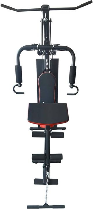 Máquina de gimnasio multifuncional para entrenar en casa. Ideal para trabajar diferentes grupos musculares. - Estructura robusta de acero. - Asiento acolchado. - Barras de press y pesas integradas.