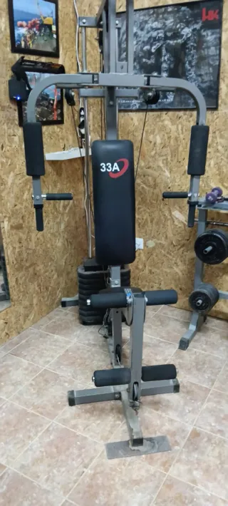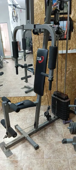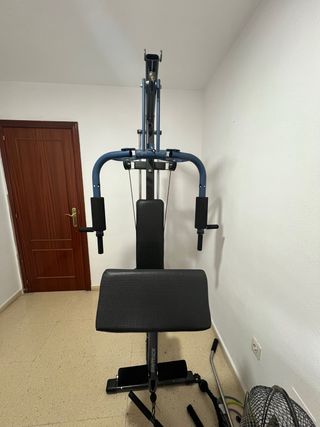 Máquina de entrenamiento multifunción completa para gimnasio en casa. Permite trabajar prácticamente todo el cuerpo con una sola máquina. Incluye barra superior para dominadas, brazos para press de pecho (pecho medio), sistema de empuje tipo press banca, poleas para ejercicios de espalda y tríceps, extensión y curl de piernas, y banco predicador para bíceps. También permite realizar múltiples ejercicios adicionales combinando poleas y accesorios, adaptando el entrenamiento a tu nivel y objetivos. Estructura robusta y estable. Está usada, con signos normales de uso, pero funciona correctamente; con pequeños retoques puede quedar como