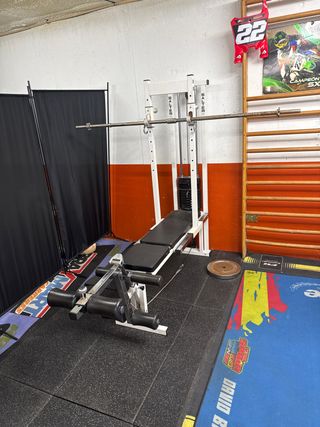 Equipo de gimnasio para entrenar en casa. - Estructura robusta de acero. - Banco integrado. - Los discos y barra no estan incluidos en el precio. - Para más información escribe a 696403529.