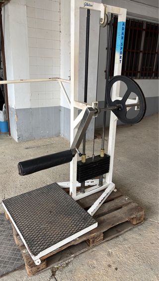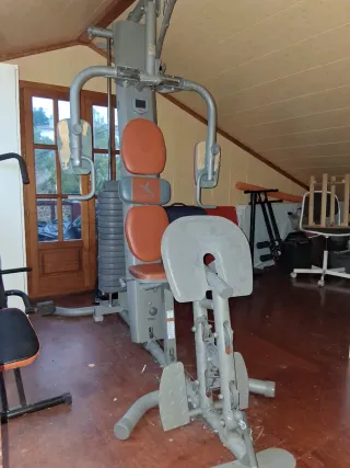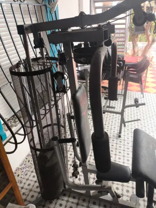 Máquina de gimnasio para entrenar en casa. Permite realizar diversos ejercicios. - Estructura de metal resistente. - la maquina esta nueva lo vendo con todo - Pesos incluidos