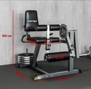 Máquina de musculación para trabajar cuádriceps e isquiotibiales. Estructura robusta de acero negro con acolchado en asiento y respaldos. - Asiento y respaldo ajustables. - Rodillos acolchados para piernas. - Soporte para discos. - Diseño compacto.