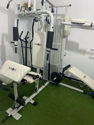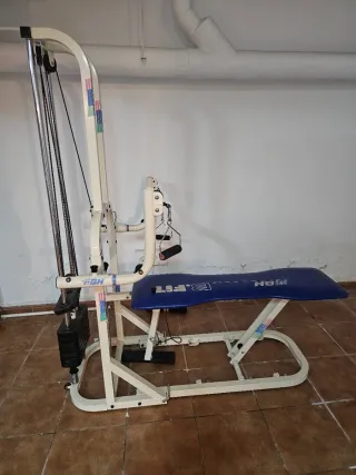 Se vende máquina de gimnasio multifunción para entrenar en casa. Ideal para trabajar diferentes grupos musculares. - Estructura robusta. - Incluye pesas. - Asiento acolchado.