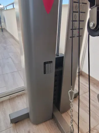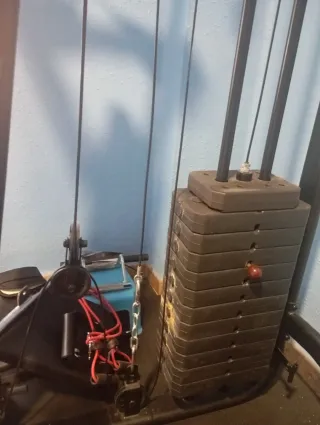 Por mudanza vendo todo el conjunto con accesorios a buen precio. Máquina de gimnasio completa para entrenar en casa. Incluye accesorios y pesas. - Estructura metálica robusta. - Poleas y cables para diversos ejercicios. - Torre de pesas. Precio por todo el conjunto con agarres.