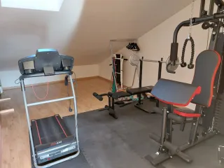 Equipo de gimnasio para entrenar en casa. Multiestacion 250 € Tiene hasta 60kilos , puedes hacer jalón al pecho , apertura , extensión cuádriceps y remo. Vendo con varios agarres que se ven en las fotos. Dominadas 100 € Vendo con goma para ayudar a hacerlas. Cinta de correr (no eléctrica) 100€ Pesas 10 kg 20€ Las vendos con las distintas barras que se ven en la foto. Banco 35€ Banco ajustable en distintas posiciones. Saco de pared 20€ Con guantes, venda y comba Si haría envío del saco y del banco se podría mirar . Entrega en mano.En la puebla de almoradiel