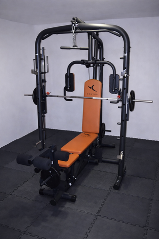 Equipo de gimnasio para entrenar en casa. Estructura robusta y diseño compacto. - Asiento acolchado. - Barras de pesas incluidas. - Bicicleta spinning opcional.