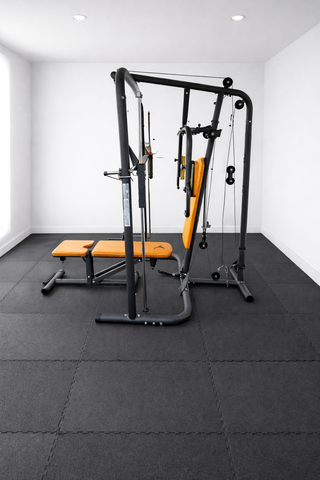 Equipo de gimnasio completo para entrenar en casa. - Incluye banco, pesas y accesorios. - Diseño compacto y robusto.