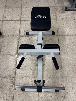 Máquina de gimnasio para trabajar los abdominales y otros músculos. - Estructura metálica. - Asiento acolchado. - Pedales para los pies. - Mangos de agarre.