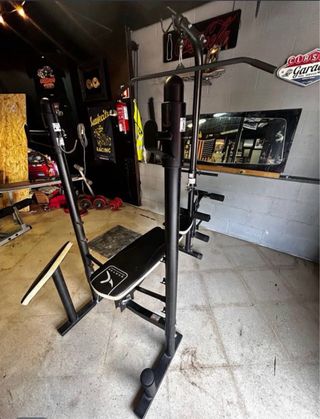 Equipo de gimnasio versátil para entrenar en casa. - Barra de dominadas integrada. - Banco ajustable. - Saco de boxeo incluido. Tiene los apoyabrazos un poco pelados.