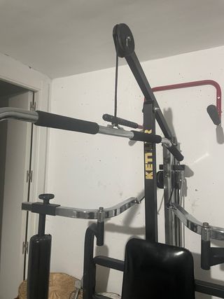 Máquina de gimnasio para entrenar en casa. - Estructura metálica robusta. - Asiento y respaldo acolchados. - Barra de dominadas integrada. - Poleas para ejercicios variados.