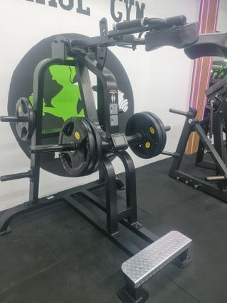 Equipo de gimnasio profesional para entrenamiento de piernas. - Estructura robusta de acero negro. - Plataforma de apoyo texturizada. - Mangos de agarre ergonómicos. - Discos de peso incluidos.