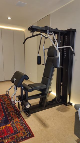 Equipo de gimnasio para entrenar en casa. - Máquina multiestación con torre de pesas. - Banco de pesas con barra. - Elíptica. - Barra de dominadas.