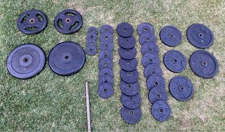 - Disco de 20kg de caucho (gervasport): 35€/ud (2 disponibles) - Disco de 10kg de caucho (domyos): 25€/ud (2 disponibles) - Disco de 10kg hierro fundido (domyos): 15€/ud (2 disponibles) - Disco de 5kg hierro fundido (domyos): 7,5€/ud (3 disponibles) - Disco de 2kg hierro fundido (domyos) 3€/ud (16 disponibles) - Disco de 1kg hierro fundido (domyos): 1,5€/ud (8 disponibles) - Disco de 0,5kg hierro fundido (domyos):1€/ud (4 unidades disponibles) - disco de 1 kg hierro fundido rojo (salter) para barra de ?mm: 1€/ud (8 disponibles) El precio total serian 245€, en caso se llevarse todos los discos se queda en 220€