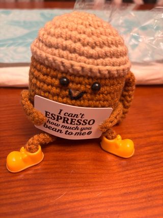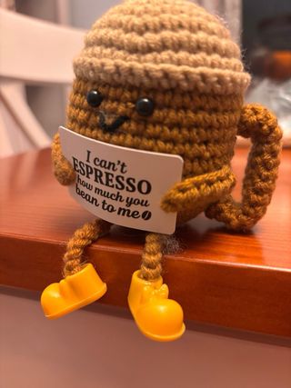 Adorable taza de café amigurumi hecha a mano con ganchillo. Es un detalle divertido y original. - Hecho a mano con ganchillo. - Diseño de taza de café. - Incluye un cartel con la frase I can't ESPRESSO how much you bean to me. 2 ud. disponibles de este modelo. Tenemos varios modelos disponibles, haz tu pedido personalizado y llévatelos con descuento. #amigurumi #hechoamano #regalooriginal #crochetlover #detalletierno #handmadegift #crochetart #coffeelover #cutehandmade #faitmain #cadeauoriginal #crochetaddict #objetMignon