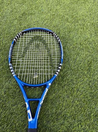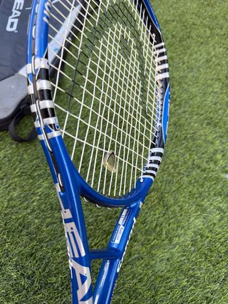 Raqueta de tenis de la marca HEAD en color azul. - Marco de aluminio. - Cuerdas blancas y negras. - Empuñadura negra.