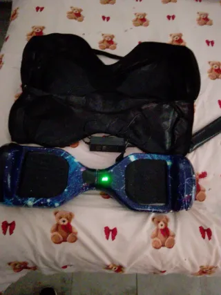 Hoverboard con diseño de galaxia en tonos azules. Incluye su bolsa de transporte negra. - Ruedas con luces LED. - Indicador de batería. - Bolsa de transporte negra. Funciona bien