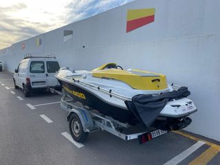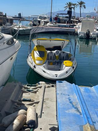Embarcación Sea-Doo con diseño deportivo en amarillo y blanco. - Asientos cómodos para varios pasajeros. - Amplia zona de proa. - Toldin plegable para sombra. - motor 4 tiempos