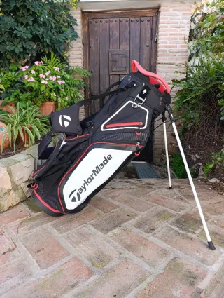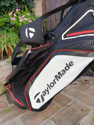 Bolsa de golf TaylorMade en color negro con detalles en rojo. Cuenta con un diseño moderno y funcional. # Callaway Ping Cleveland putter Driver Golf Titleist - Compartimentos para palos. - Correa ajustable. - Base estable con patas.