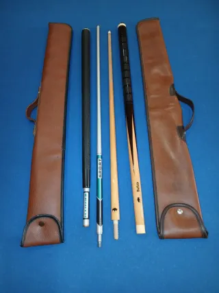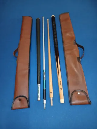 Set de tacos de billar con dos fundas de cuero marrón. - Taco de la prestigiosa marca bufalo con detalles en madera clara y negro. - Taco de aluminio de la marca Zenith Sport con detalles en negro, verde y gris. - Si interesa alguno en concreto preguntar precio.