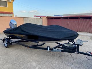 Barca CABRIL BASS 470, ideal para pesca y recreo. Diseño deportivo en color negro con detalles plateados. - Motor fueraborda Honda 80. - Sonda. - Motor eléctrico de proa Minn Kota. - Remolque incluido.