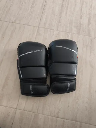 Guantes de boxeo ligeros de la marca Decathlon, modelo Outshock. Diseñados para entrenamiento y combate. - Color negro. - Cierre de velcro ajustable. - Logo de Decathlon y Outshock. - Diseño ergonómico.