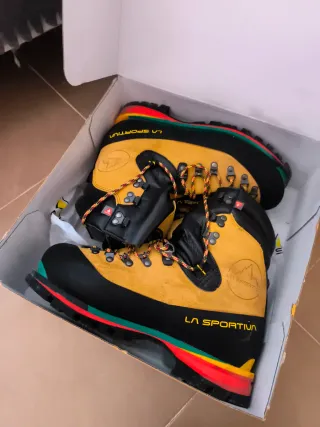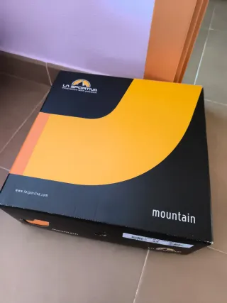 Botas de alpinismo de la marca La Sportiva. - Diseño en negro y amarillo. - Logo de La Sportiva. - Modelo: Mountain Solamente tienen una puesta.