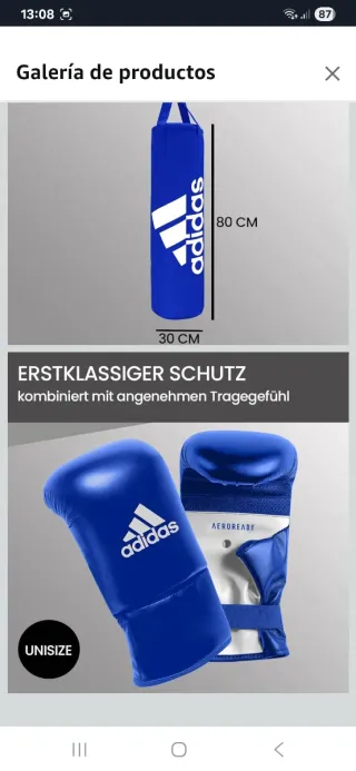 Set de boxeo Adidas en color azul, ideal para entrenamientos. - Saco de boxeo con logo grande de Adidas. - Incluye un par de guantes de boxeo. - Talla única para adultos.