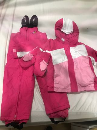Conjunto de ropa de esquí para niña en color rosa. - Chaqueta con capucha. 2 años - Pantalón con tirantes. 3 años - Incluye manoplas. - Botas. 24-25