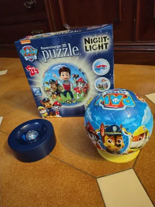 Puzzle 3D de Ravensburger con temática de Paw Patrol, diseñado para convertirse en una lámpara de noche. - 72 Piezas curvas para formar una esfera. - Incluye base con luz. - Diseño de Paw Patrol con personajes.