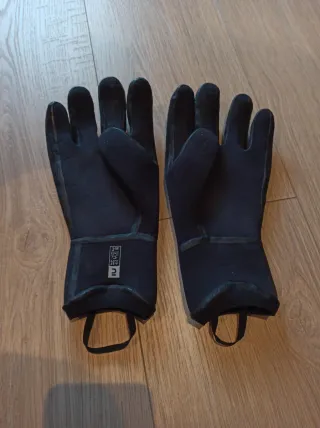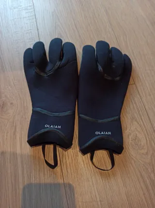 Guantes de neopreno de 3mm, ideales para surf y bodyboard. - Marca OLAIAN. -Sellado en las costuras - Diseño de dedos separados. - Tira de sujeción en la muñeca. -Usados en dos baños, me quedan grandes