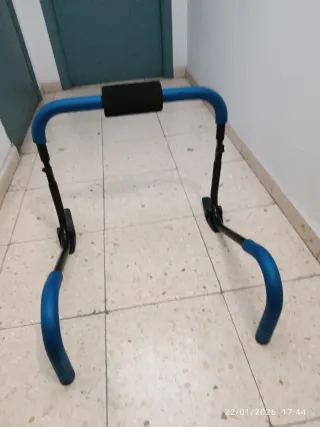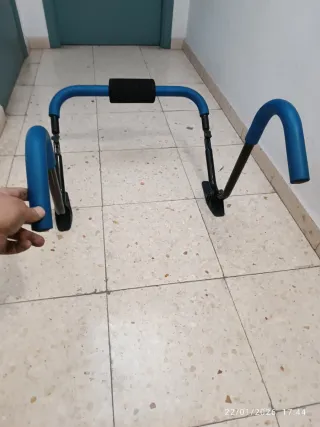 Barra de dominadas ajustable para puerta en estado excelente, como nueva. Sistema extensible con agarre central acolchado. Fácil instalación sin necesidad de obra. Ideal para entrenar en casa: dominadas, trabajo de espalda y brazos. Se vende tal cual aparece en las foto