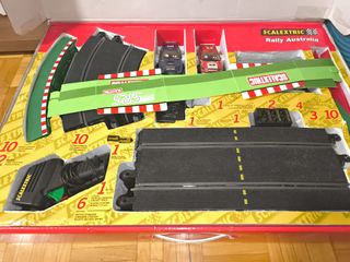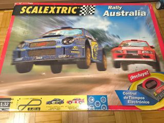 Circuito de Scalextric Rally Australia. Incluye todo lo necesario para empezar a jugar. - Coches: Subaru Impreza WRC y Mitsubishi Lancer. - Control de tiempos electrónico. - Pista de 6.49 metros.