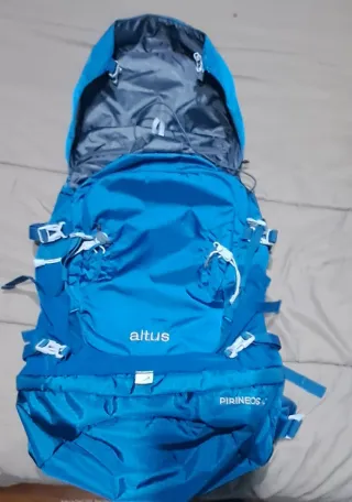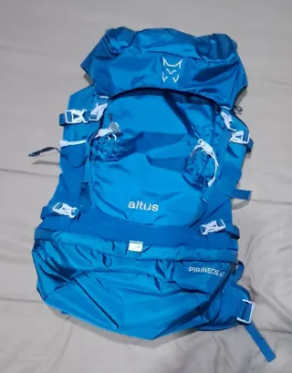 Mochila de alta montaña Altus Pirineos de 40 litros. Sin usar - Color azul vibrante. -Doble porta piolet -Porta bastones - Diseño robusto para expediciones. - Compartimento principal espacioso. - Múltiples puntos de ajuste y correas. - Logo de la marca Altus visible.