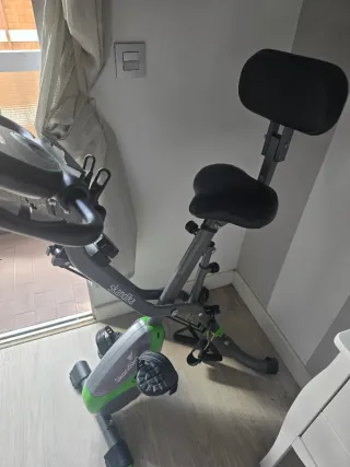 Bicicleta estática plegable Skandika Foldaway X-3000, ideal para entrenar en casa. - Diseño compacto y plegable. - Asiento y manillar ajustables. - Pedales con correas de sujeción. Bicicleta estática plegable con 8 niveles de resistencia y freno magnético. Permite entrenar todo el cuerpo con bandas de tensión. Tiene pantalla Bluetooth compatible con app, sillín ajustable y diseño plegable fácil de guardar. En perfecto estado, solo le falta la tapa de las pilas como de puede apreciar en una de las fotos
