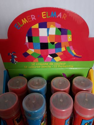 Bote de lápices de colores de la marca Petit Jour, con diseño de Elmer o Maisy. Nuevo. Con precinto. Restos de tienda. Quedan 8 unidades de Maisy y, 2 unidades de Elmer. Cada unidad cuesta 3 euros y, 2 unidades cuestan 5 euros. - Contiene 12 lápices de colores. - Presentación en bote cilíndrico.