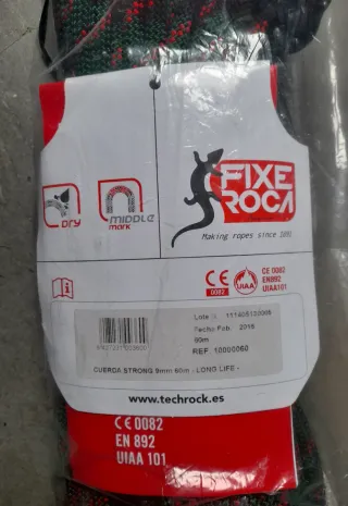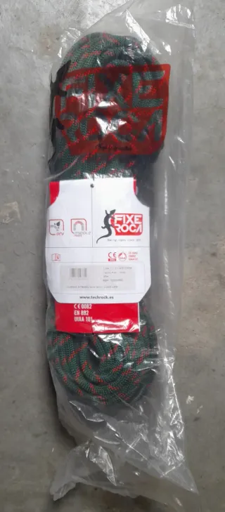 Cuerda de escalada Fixe Roca, modelo CUERDA STRONG. - Longitud: 60 metros y 9mm de grosor. - Color: Verde y rojo. - Certificaciones: CE 0082, EN 892 cuerda dinámica , UIAA 101. - Tratamiento Dry. Precintada , sin ningún tipo de uso, envío rápido y muy bien embalado. Petzl , Mammut, Beal, ID. Perfecta para tus aventuras de escalada , rappel, barranquismo, buscraf. Las fotografías corresponden con la cuerda ofertada .