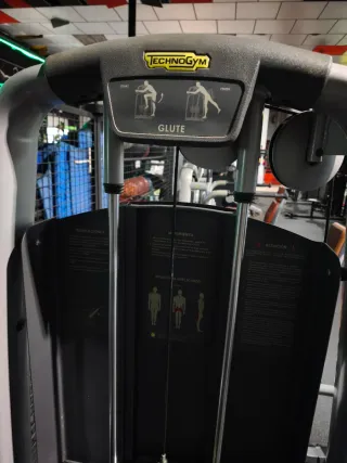 Máquina de gimnasio Technogym para el entrenamiento de glúteos. Diseño robusto y profesional. - Asiento acolchado. - Agarres ergonómicos. - Reposapiés texturizado.